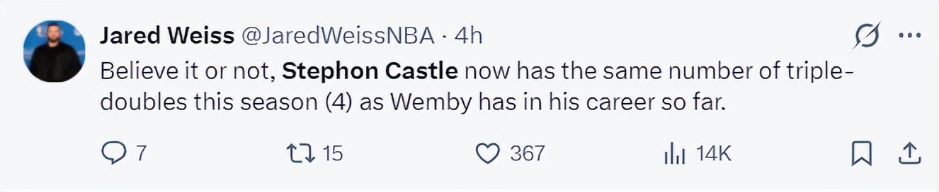 马刺记者杰登-韦斯写道:你们别不信,卡斯尔本赛季第四次三双已经跟文班亚马职业生涯一样多了。