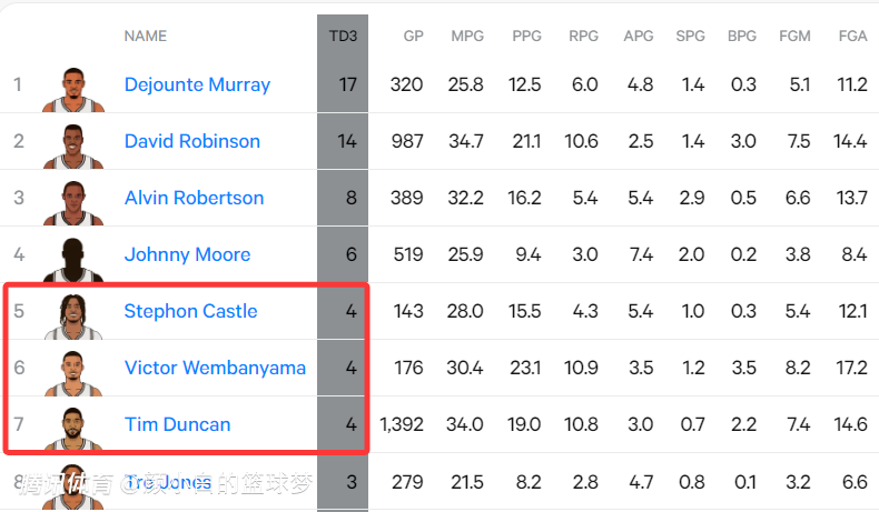 2.卡斯尔第4次三双队史第五多,已经跟文班亚马、邓肯一样多,(邓肯19年生涯);