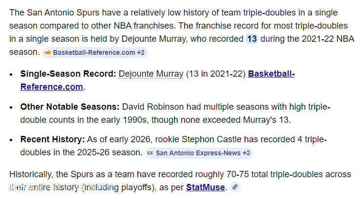 3.卡斯尔单赛季4次三双是联马刺队史第二多,第一多是德章泰-穆雷13次;