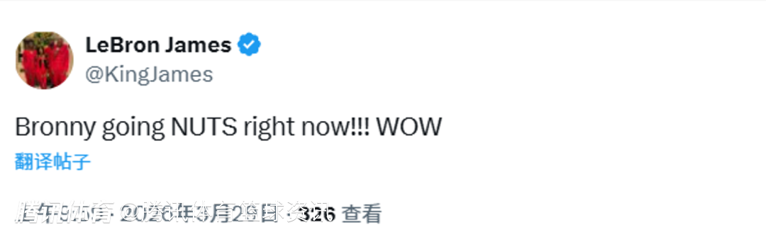 2026-03-29 10:20北京时间3月29日,G联赛常规赛,南湾湖人以140-132击败苏瀑天空力量,此役布朗尼发挥出色,全场拿到26分7篮板5助攻,命中6个三分球刷新生涯新高。而在比赛中,詹姆斯也更新社媒,盛赞自己的大儿子。