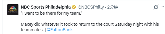 2026-03-29 10:40北京时间3月29日,NBA常规赛继续进行,76人队118-114击败黄蜂队。马克西此役复出,18投10中得到26分7篮板8助攻1抢断1盖帽,在场正负值+13。赛后,他接受媒体采访,谈到了复出后的感受。