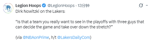 2026-03-29 11:20北京时间3月29日,前NBA球员诺维茨基在节目中谈到了湖人队,他警告其他球队,季后赛中的湖人队不可小觑。