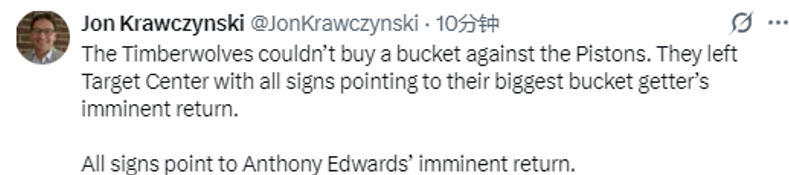 2026-03-29 11:30北京时间3月29日,根据森林狼记者Jon Krawczynski报道,爱德华兹有望在下周二对阵独行侠队的比赛中迎来复出。