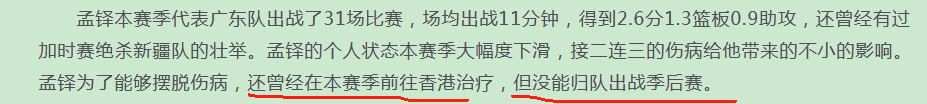 还有媒体称,孟铎为了能够摆脱伤病,还曾经在本赛季前往香港治疗,但没能归队出战季后赛。