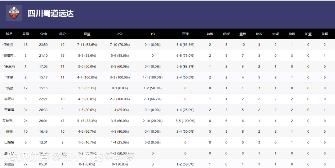 在四川队有三个顶级外援的情况下,王思雨依旧是这支四川女篮的先发,全场比赛17分钟,6中3,拿到11分3篮板2助攻1抢断1失误,命中率50%,正负值+20。三个外援的数据为:坎贝奇19分10篮板,奥贡鲍尔17分6篮板,霍华德16分7篮板。