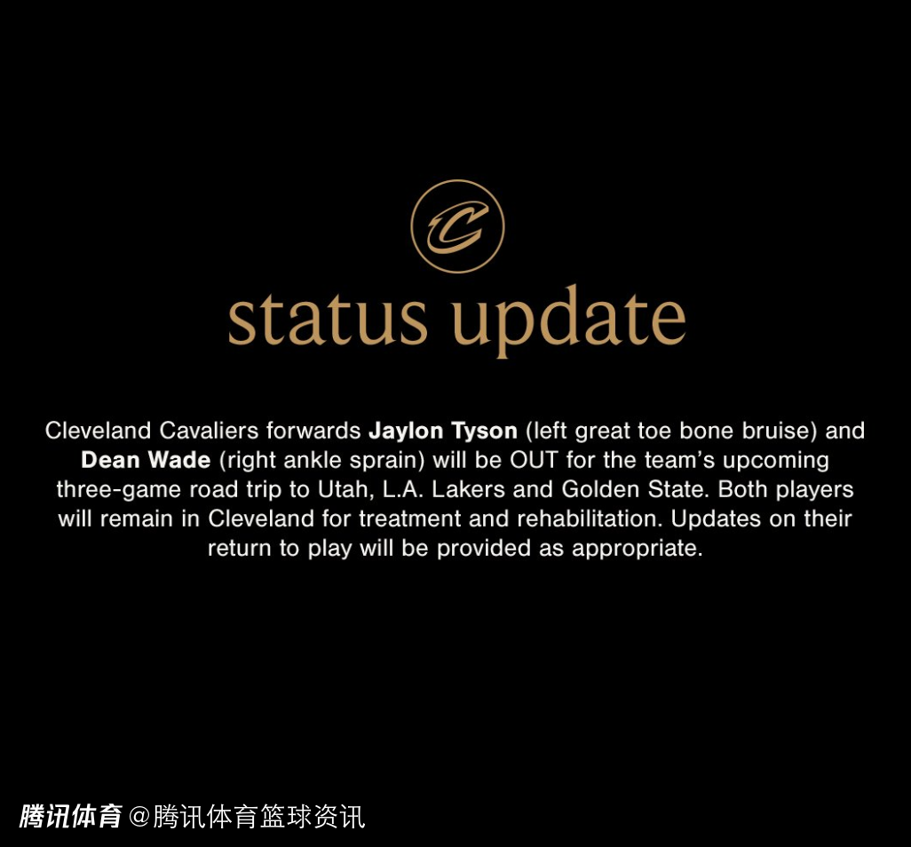 2026-03-30 01:10北京时间3月30日,骑士队官方宣布,杰伦-泰森(脚趾伤势)和迪恩-韦德(脚踝伤势)将留守克利夫兰,缺席接下来的西部三连客之旅。