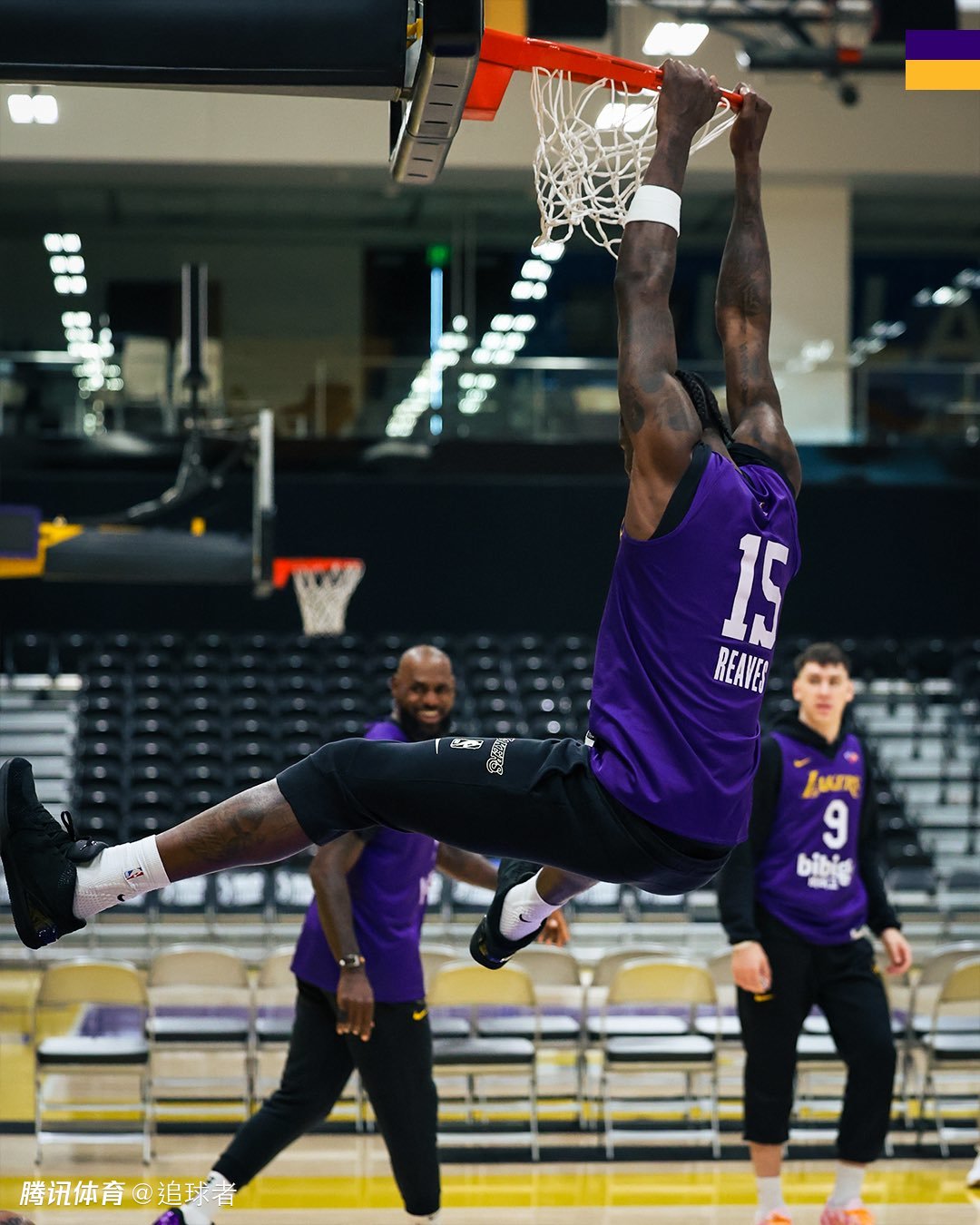 艾顿身穿里夫斯的5号球衣上演双手暴扣,镜头中詹姆斯开怀大笑。