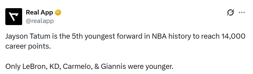 凭借这一表现,塔图姆成为NBA历史上第五年轻突破生涯14000分的前锋,仅次于詹姆斯、杜兰特、安东尼和字母哥。