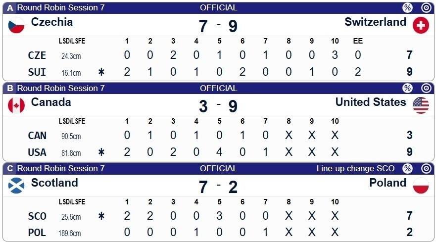 另外三场对决里,捷克7-9瑞士、加拿大3-9美国、苏格兰7-2波兰。