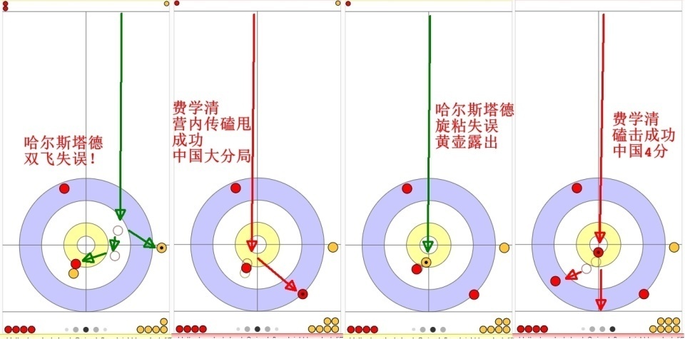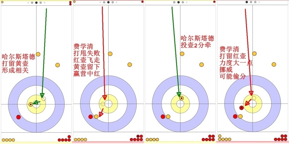 哈尔斯塔德双飞出现严重失误,让2近黄壶成为1近红壶垫背;费学清第一投营中分壶妙到毫巅,中国三分局面。
