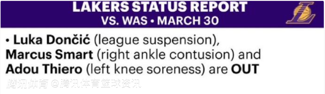 2026-03-30 09:20北京时间3月30日,湖人官方更新了明日对阵奇才的伤病报告,东契奇(联盟禁赛)、斯玛特(右脚踝挫伤)、蒂耶罗(左膝酸痛)缺席比赛。