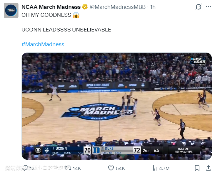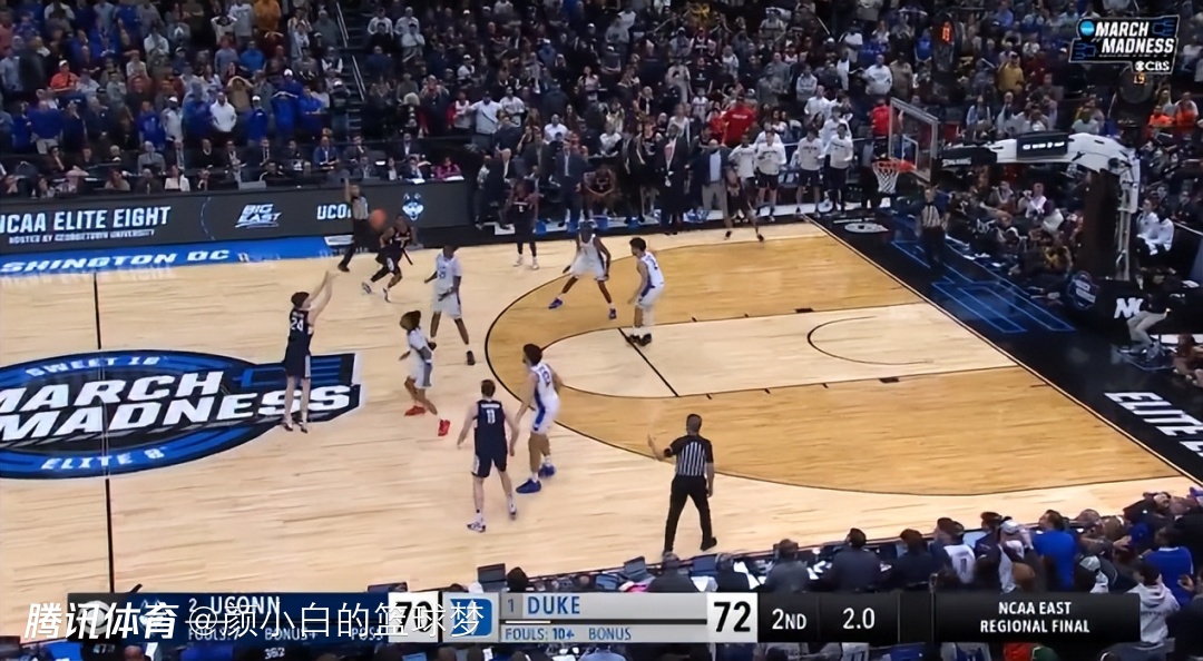 2026-03-30 10:00北京时间3月30日,NCAA疯狂三月精英八强赛,杜克大学72-73惜败康涅狄格大学。这场比赛杜克上半场还领先康大13分之多,没想到下半场杜克核心们纷纷哑火,最终在决胜时刻出现了低级的失误,康大用一个logo的超远三分绝杀成功。