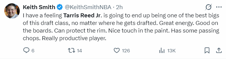 NBA记者肯尼-史密斯为他抱不平,他说:我有种感觉,不管里德被哪支球队选中,他都会成为本次选秀中最出色的中锋之一。他充满活力,篮板球能力极强还能护筐,内线技术娴熟,投篮手感柔和,还有一定的传球能力,他会是出色的球员。