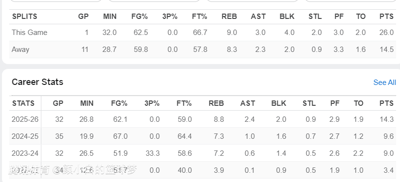 这位在NCAA打了四年的老鸟,本赛季场均26.8分钟,拿到14.3分2.4助攻8.8篮板0.9抢断2盖帽,命中率62.1%,实际上数据并不算优异,但进入疯三后就不同了。