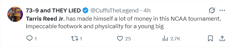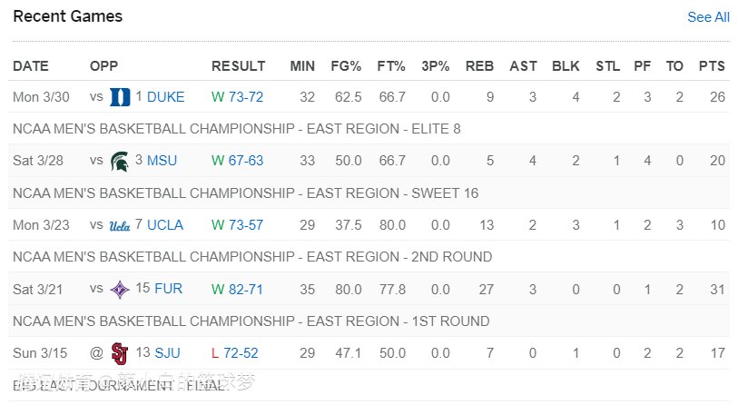 进入NCAA疯狂三月后他的表现就炸了,第一轮17分7篮板1盖帽,第二轮31分27篮板3助攻,1/16强赛10分13篮板2助攻1抢断3盖帽,1/8强赛20分5篮板4助攻2盖帽1抢断,1/4强赛拿到26分9篮板3助攻2抢断4盖帽。