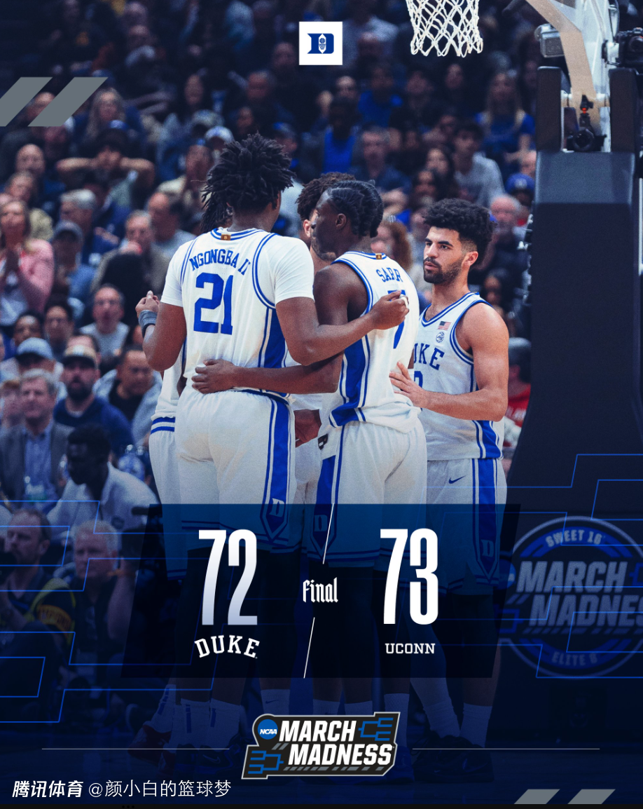 2026-03-30 10:30北京时间3月30日,NCAA疯狂三月精英八强,康涅狄格大学73-72击败杜克大学晋级。康大是大东联盟第一,杜克是大西洋联盟第一,这两支顶级球队的碰撞,最终康大在上半场落后15分的情况下完成逆转,凯登致命失误,马林斯完成了读秒绝杀。