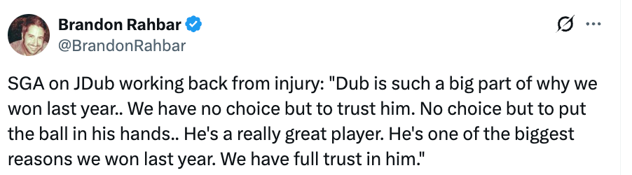 谈及近期重新迎来复出的杰威,亚历山大表示:“他是我们去年夺冠的关键一环。我们只能信任他,也只能把球交到他手上。他是个非常出色的球员,是我们去年能赢球的最大功臣之一,我们对他完全信任。如果我们想再次夺冠,就需要他站出来成为那个关键人物。”此役杰威出战29分钟,投篮11中7,拿到22分。
