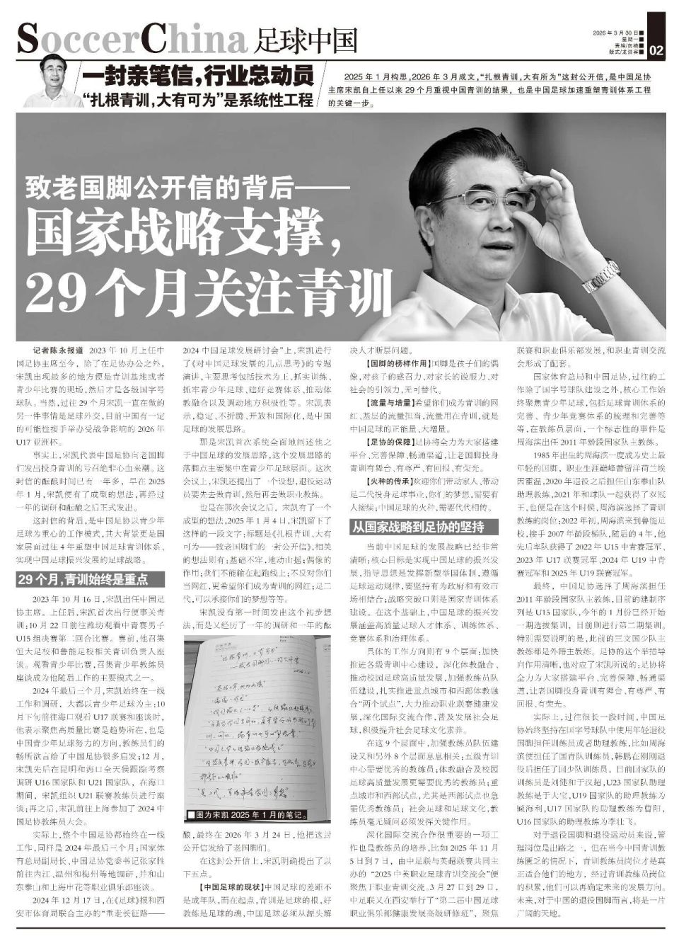 2026-03-30 11:30【一封亲笔信,行业总动员】3月24日,中国足协主席宋凯发布了一封公开信,呼吁退役国脚扎根青训,为中国足球稳定根基做贡献。公开信发布后引发了媒体和球迷的热烈讨论,大家在赞叹宋凯为中国青训迅速发展布局的同时,也在讨论,宋凯发布这封信件的时机,此外,想让退役国脚都来参与中国足球青训,中国足协应该有哪些政策的配套和举措,本报针对此做了详细的调查和解析。
