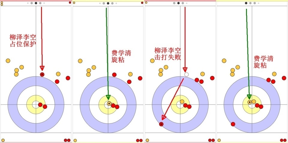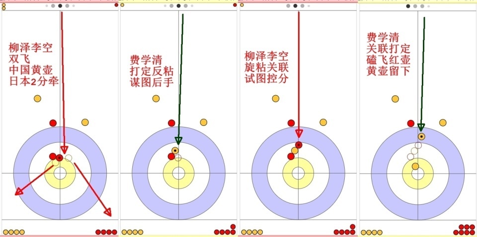 大本营的拉扯里,费学清利用钟摆效应击打,成功磕飞日本两颗关联红壶,但中间的黄壶留下...中国拿到2分。