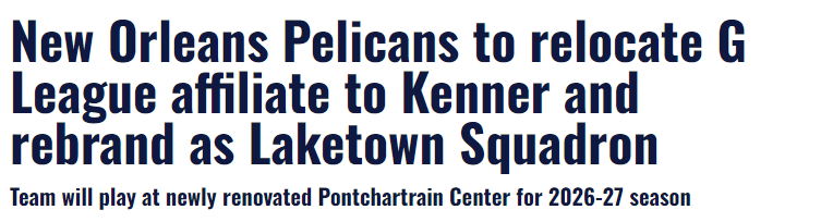 官宣!鹈鹕发展联盟球队搬迁路易斯安那 新赛季更名莱克敦中队