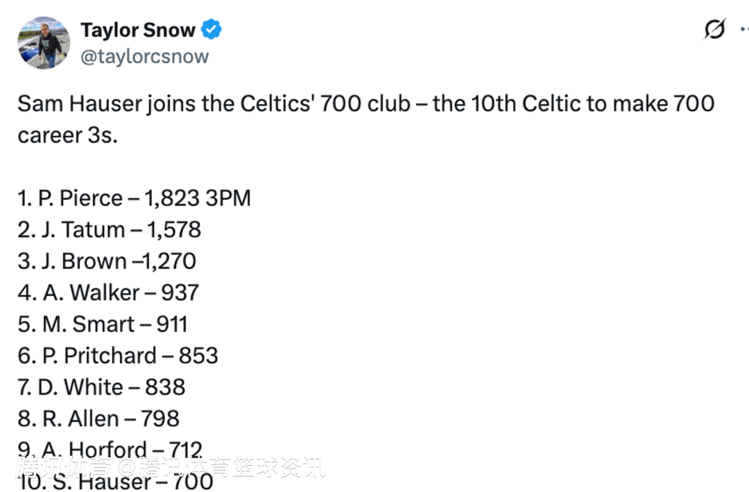 2026-03-31 08:50北京时间3月31日,NBA常规赛,凯尔特人对阵老鹰,本场比赛豪瑟达成三分球里程碑,成为绿军队史上第十位投中700个三分球的球员。