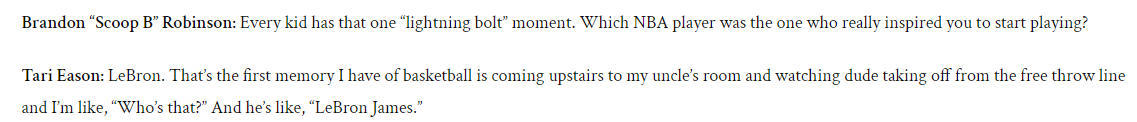 伊森表示:“我对篮球最初的记忆,就是跑到楼上叔叔的房间,看詹姆斯从罚球线起跳扣篮,我当时就问‘那是谁?’我叔叔告诉我,‘勒布朗-詹姆斯。’就是他从罚球线起跳那一下!我当时就想,‘这到底是谁啊?’三岁的孩子根本搞不懂发生了什么,但篮球早就融入我的生活了。我妈妈也打过球,这就像是我与生俱来的使命。”