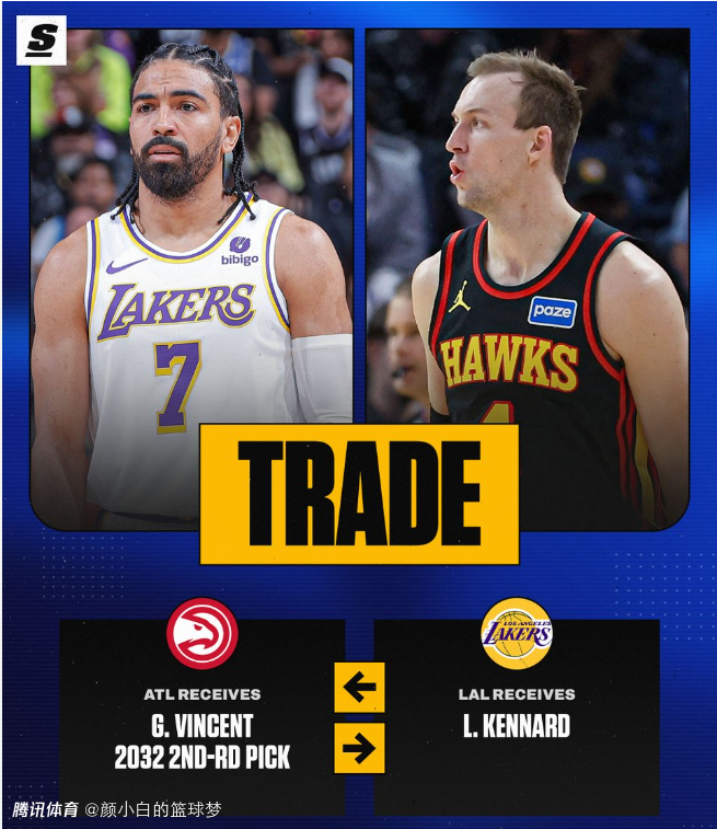 湖人与老鹰的交易细节,湖人用2032年次轮签+文森特换走肯纳德,肯纳德加盟湖人后场均21.8分钟,拿到8.3分2.3篮板1.7助攻0.5抢断,命中率54.8%,三分命中率45.9%,场均命中1.4个三分球。