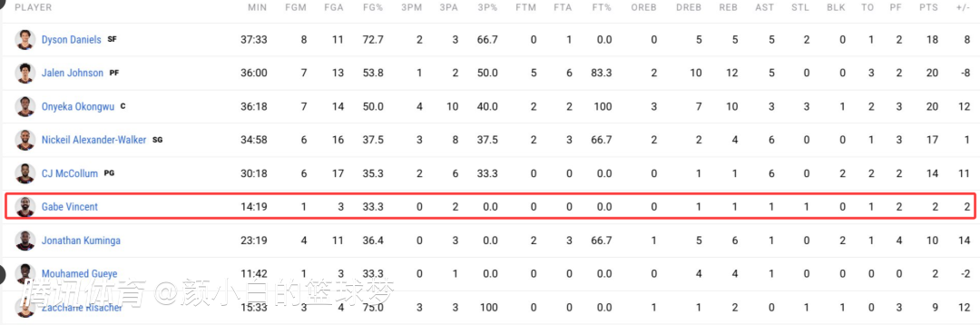 这场比赛老鹰爆冷击败东部第二的绿凯全队都很开心,但湖人旧将盖布-文森特此役依旧 是一个三单知网,全场比赛14分钟,3中1,只拿到2分1篮板1助攻1抢断1失误,命中率33.3%。