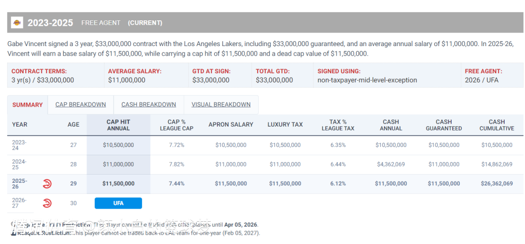 文森特三年3300万的合同到期后他可能就没有千万年薪的可能性,今夏文森特只能去追逐底薪或部分中产560万左右的合同了。