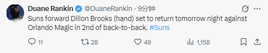 该记者写道:“太阳队前锋狄龙-布鲁克斯(手部伤势)将于明日对阵奥兰多魔术队的比赛中复出,这也是球队背靠背赛程的第二场。”