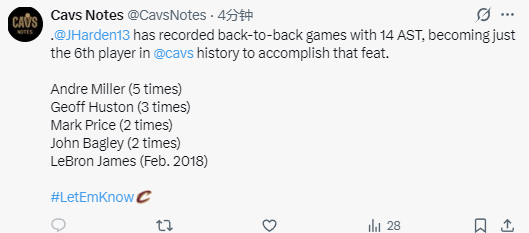 哈登单场14次助攻追平赛季最高,同时这也是他连续第2场比赛送出14次助攻,成为骑士队历史上第6位能做到这点的球员,其余5人分别是安德烈-米勒(5次)、杰夫-休斯顿(3次)、马克-普莱斯(2次)、约翰-巴格利(2次)和詹姆斯。此外,哈登还收获了本赛季第20次两双,已经连续第12个赛季拿到至少20次两双。