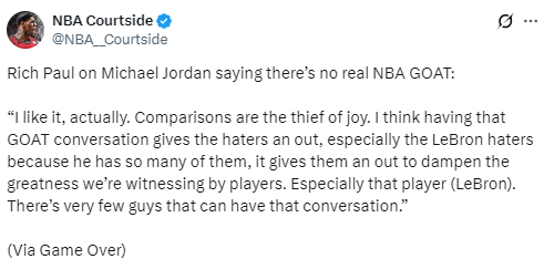 2026-03-31 21:10北京时间3月31日,知名经纪人里奇-保罗在直播节目中,针对传奇球星迈克尔-乔丹称NBA没有真正的历史最佳球员一事表态。