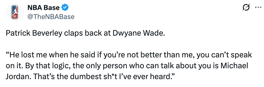贝弗利怒怼韦德:你三分还不如威少庄神 照你这说法只有乔丹能评价你?