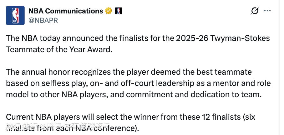 这一奖项旨在表彰NBA球员中,基于以下特质被认定为最佳队友的球员: