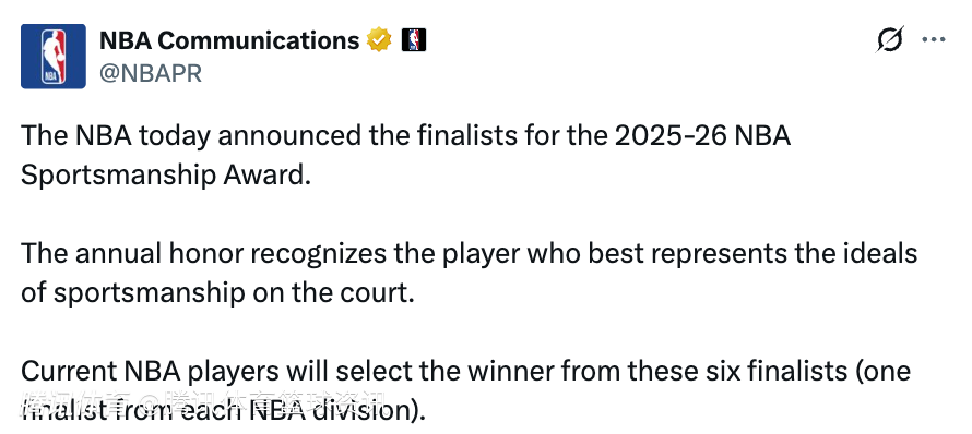 这一奖项旨在表彰在赛场上最能体现体育精神与职业道德的球员,本届NBA体育道德风尚奖将从这6位最终候选人中选出获奖者(每个分区各1名候选人)。