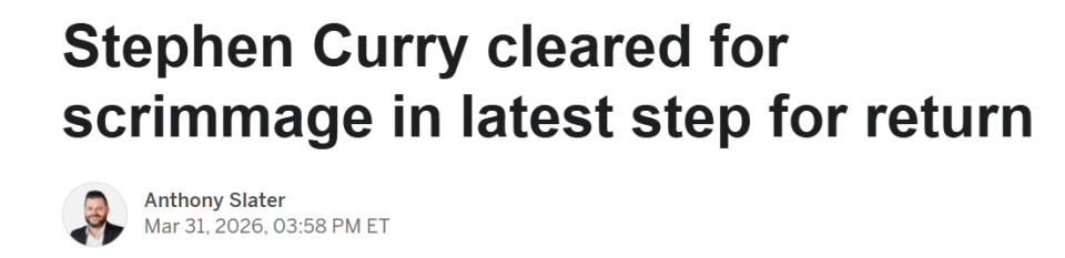 2026-04-01 05:30北京时间4月1日,据ESPN报道,勇士球星斯蒂芬-库里终于在医疗团队的许可下,于今日参加了五对五对抗训练,这是他因持续性右膝伤势复出前最新、也是最关键的一步。