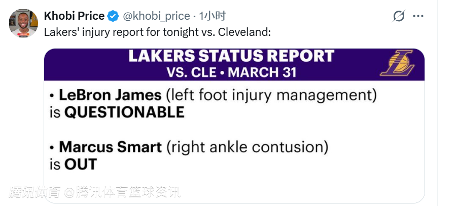 2026-04-01 06:00北京时间4月1日,NBA常规赛继续进行,湖人对阵骑士。赛前,湖人方面更新球队本场比赛伤病报告,詹姆斯(左脚伤势管理)出战成疑,斯马特(右脚踝挫伤)确定缺阵。