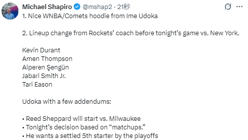 火箭变阵!乌度卡按对位调整阵容:伊森取代谢泼德重回首发对阵尼克斯