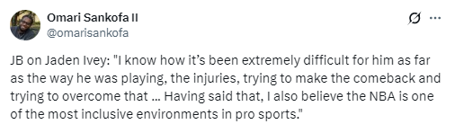 “话虽如此,我依然相信NBA是职业体育中最具包容性的环境之一,它真心尊重并赞美不同种族、不同背景、不同性取向等等一切差异。NBA让人们凝聚在一起。我认为这是我们这项运动最棒的地方,我们也明白自己肩负着这样的责任,日复一日践行这一点——给人们做自己的机会。”