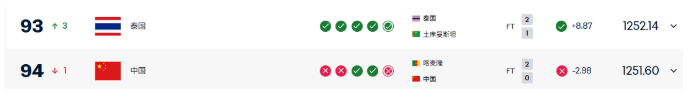 另外值得一提的是,此前在国足2-0战胜库拉索之后,国足的即时排名曾上升一位来到第92。随后在FIFA系列赛第二场不敌喀麦隆之后又跌落到93。如今又被泰国反超来到第94位了。