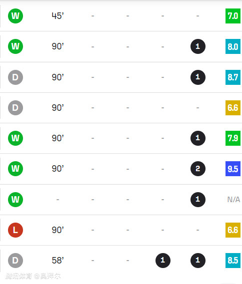 事实上,进入2026年以来,38岁的梅西状态丝毫没有下滑。近7场比赛,梅西4次得到8分以上的高分,只有3月12日对纳什维尔一战得分在7分以下,当时得到6.6分。