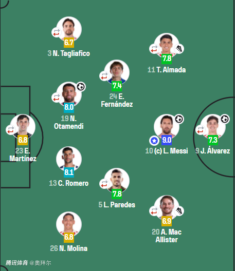 在赛后评分里,梅西得到了全场最高的9分。梅西全场比赛送出3次关键传球,75次传球63次成功,传球成功率达到84%。