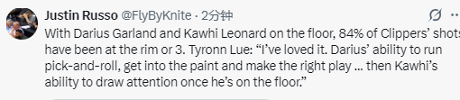 在谈到加兰和莱昂纳德的组合时,卢说道:“我很喜欢这套组合,就像我之前说的,加兰既能推进、打挡拆、冲击内线,做出正确的传球选择,也具备远距离投射能力;而莱昂纳德则能吸引大量防守注意力,只要他在场上,就会遭遇包夹,一旦他杀到禁区,防守球员就会收缩,这就为队友创造出了空篮、扣篮和三分的机会。”
