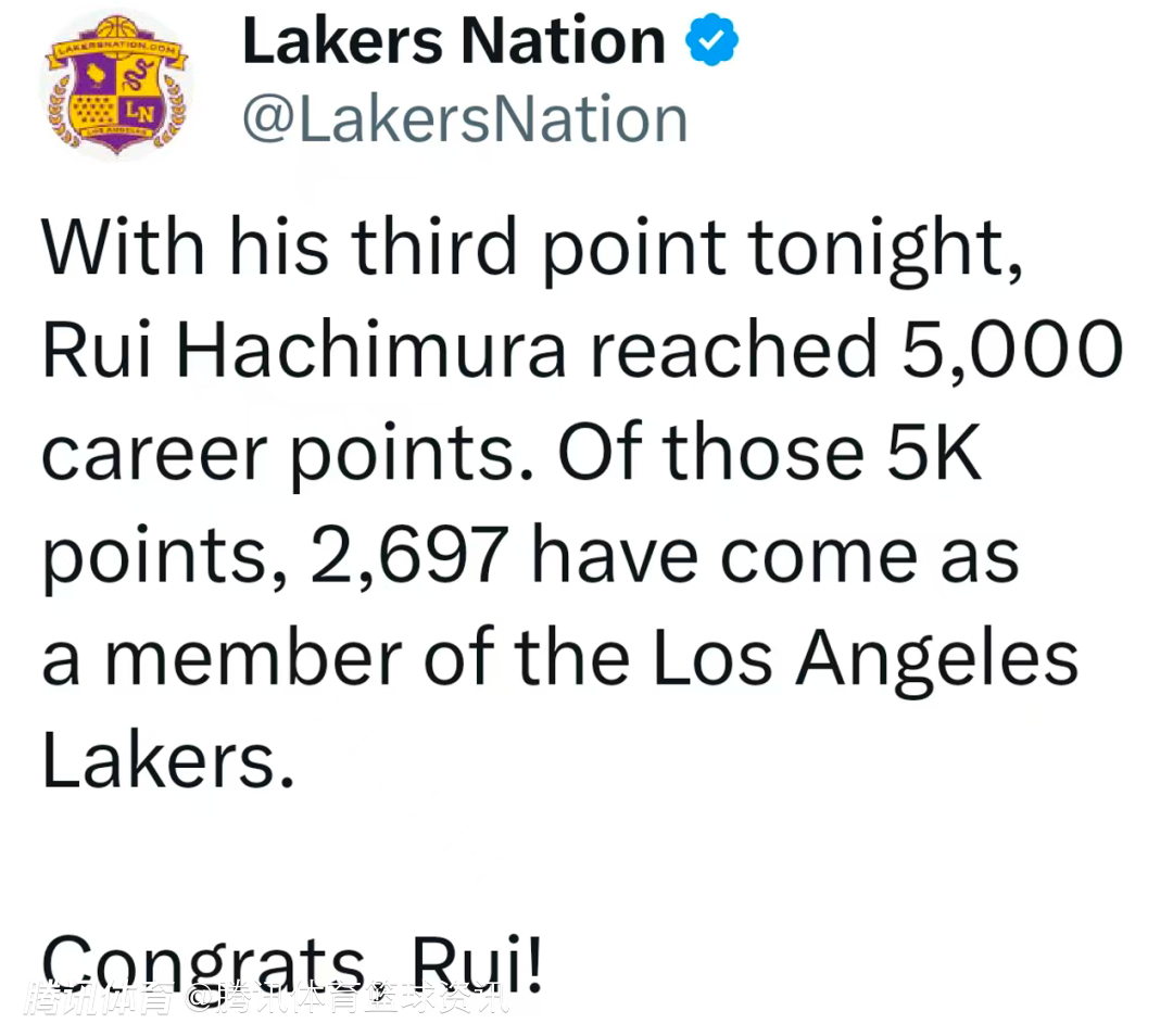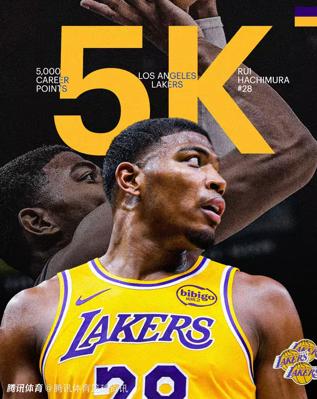 比赛进行至第二节时,凭借今晚命中的第3记进球,八村垒生涯总得分突破5000分大关。在这5000分中,有2697分是他身披湖人战袍时得到的。