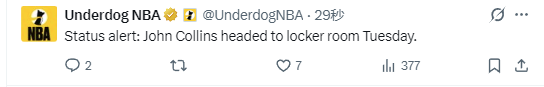 从慢镜头回放来看,科林斯是在拼抢篮板球时与大洛佩兹相撞,疑似膝盖受伤,因此选择返回更衣室接受检查。在受伤下场之前,科林斯已出战21分钟,5投5中得到12分5篮板1助攻1抢断。
