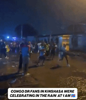 在民主刚果首都金沙萨,球迷雨夜狂欢。当地时间凌晨1点,民主刚果球迷冒着大雨,在街头狂奔、高歌、呐喊,庆祝这一激动人心的时刻。接受采访时,球迷难掩激动之情:“我们付出了一切,52年了!周三我们不用上班,这是我们国家的假日,我们要整晚庆祝,整晚开派对!这场胜利,会让我们整个国家都团结起来,让我们国家受益。”