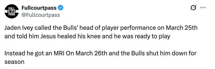 离谱!艾维曾称耶稣治好自己膝盖 核磁共振检查后公牛宣布其赛季报销
