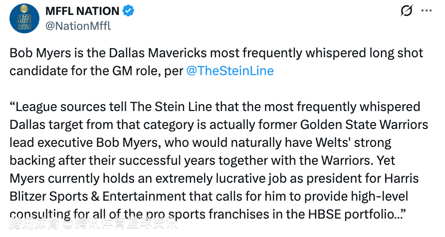 Stein表示:“联盟消息人士透露,独行侠在该类别中最常被讨论的目标,正是前金州勇士队高管鲍勃-迈尔斯。他与库班的得力助手威尔特曾在勇士合作多年,关系深厚,因此自然能获得后者的强力支持。不过,迈尔斯目前手握一份待遇极其优渥的工作,担任哈里斯-布利策体育娱乐公司(HBSE)总裁,负责为该集团旗下所有职业体育俱乐部提供高层咨询服务。”