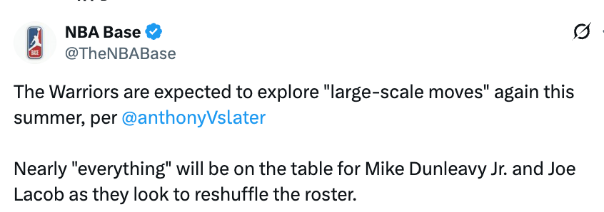 2026-04-02 00:40北京时间4月2日,据勇士队记Anthony Slater报道,勇士队预计将在今年夏天再次探索 “大规模阵容变动”。