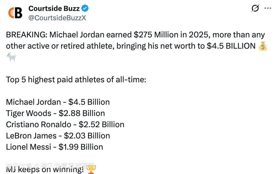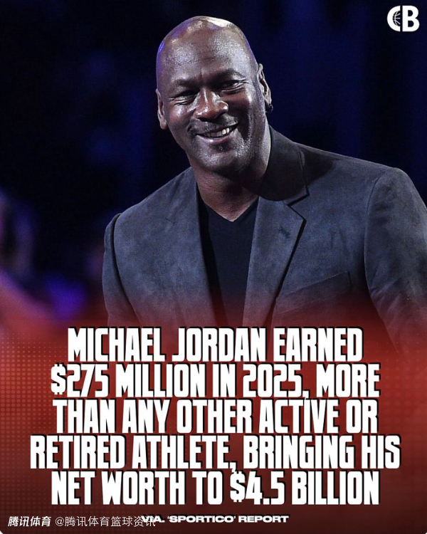 2026-04-02 02:30北京时间4月2日,据美媒CourtsideBuzz报道,迈克尔-乔丹2025年收入达2.75亿美元,超过所有现役及退役运动员,净资产升至45亿美元。